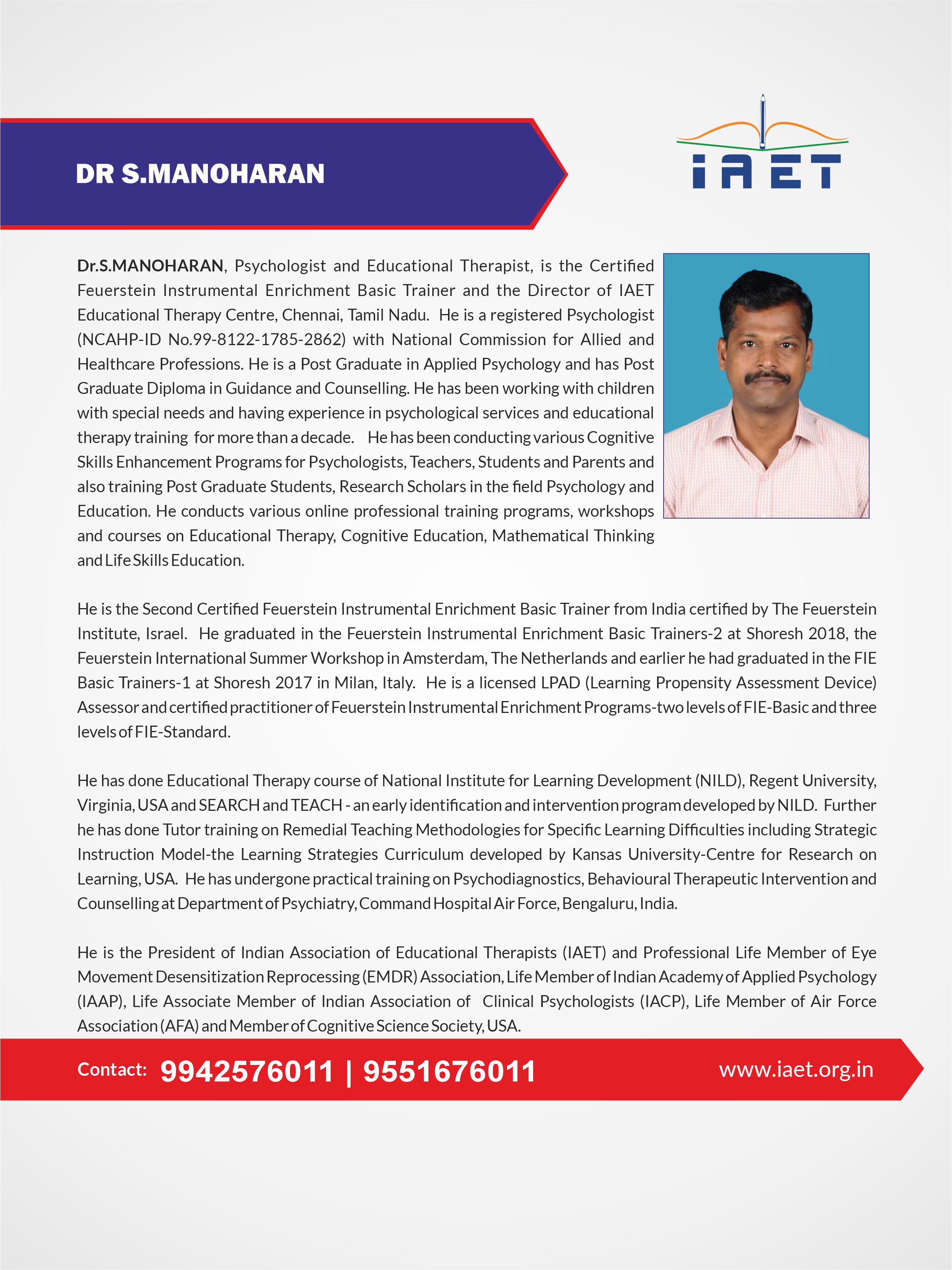 Dr.S.MANOHARAN, Psychologist and Educational Therapist, is the President of IAET, Certified Feuerstein Instrumental Enrichment Basic Trainer and the Director of IAET Educational Therapy Centre, Chennai, Tamil Nadu. He is a registered Psychologist (NCAHP-ID No.99-8122-1785-2862) with National Commission for Allied and Healthcare Professions. He is a Post Graduate in Applied Psychology and has Post Graduate Diploma in Guidance and Counselling. He has been working with children with special needs and having experience in psychological services and involved in educational therapy training for more than a decade and conducted various Thinkspire-Cognitive Skills Enhancement Programs for Psychologists, Teachers, Students and Parents. He has been training Post Graduate Students, Research Scholars in the field Psychology and Education. He conducts various online professional training programs and courses and has trained more than five hundred professionals. He also conducts Feuerstein Instrumental Enrichment Basic courses.