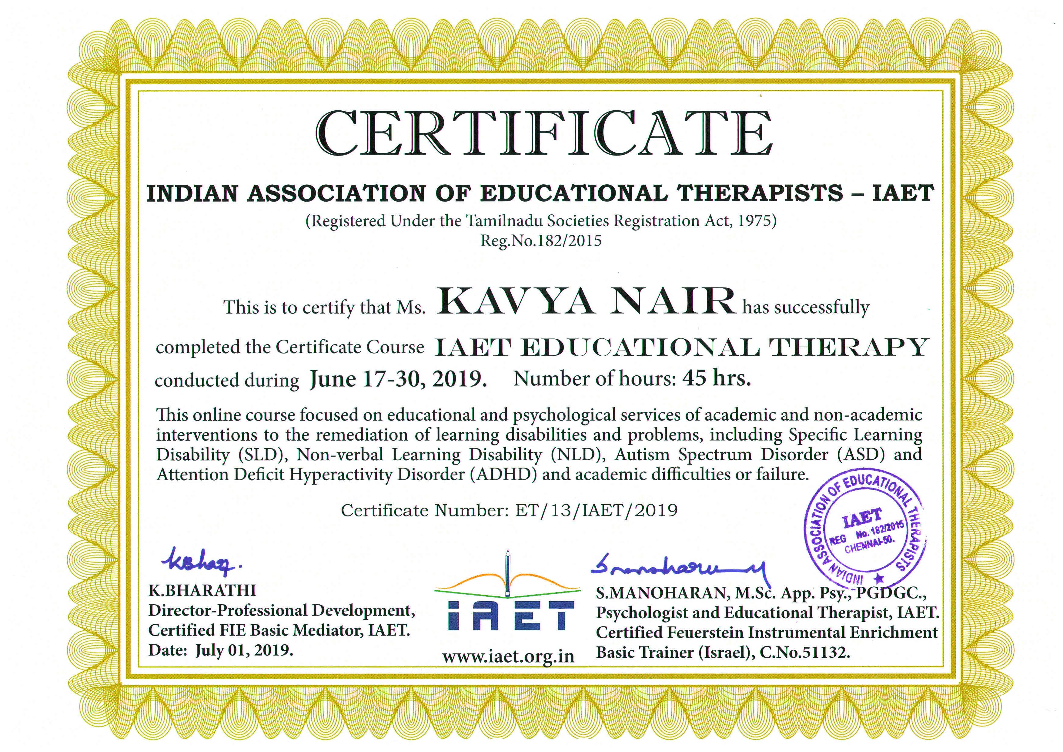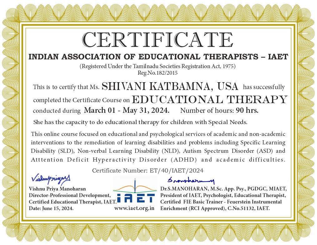 Dr. PAVANA S, PSYCHIATRIST, BENGALURU. IAET EDUCATIONAL THERAPY COURSE CERTIFICATE.