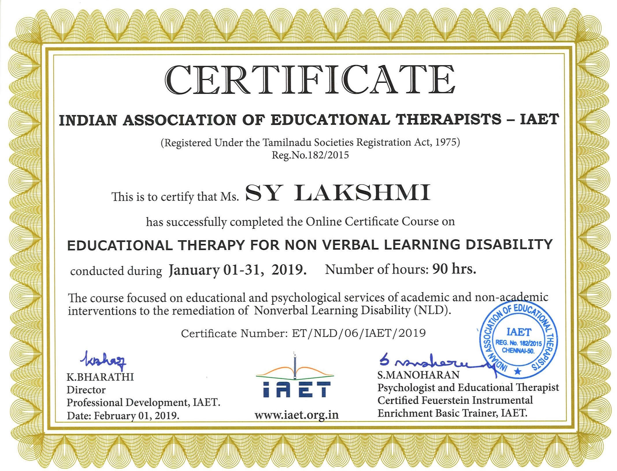 Mrs. SUMANA SINHA, EDUCATIONAL THERAPIST, HYDERABAD. EDUCATIONAL THERAPY FOR NONVERBAL LEARNING DISABILITY (NLD) COURSE CERTIFICATE.