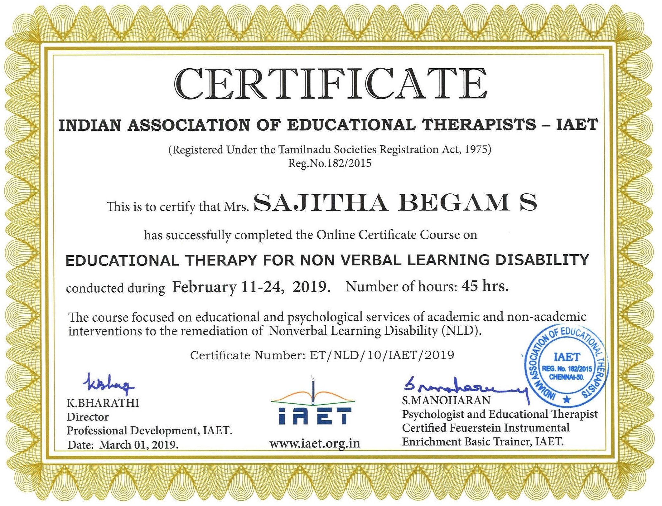 EDUCATIONAL THERAPY FOR NLD CERTIFICATES APRIL-JUNE 2019