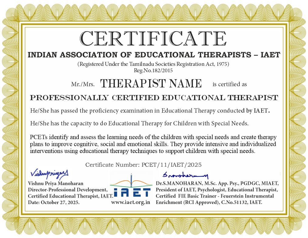 A PCET (Professionally Certified Educational Therapist) is an educational therapist certified by the Indian Association of Educational Therapists (IAET) to work with students facing learning challenges. The certification is obtained by passing the assessment set by the IAET that demonstrates proficiency in educational therapy knowledge and skills. The PCETs will do the following: