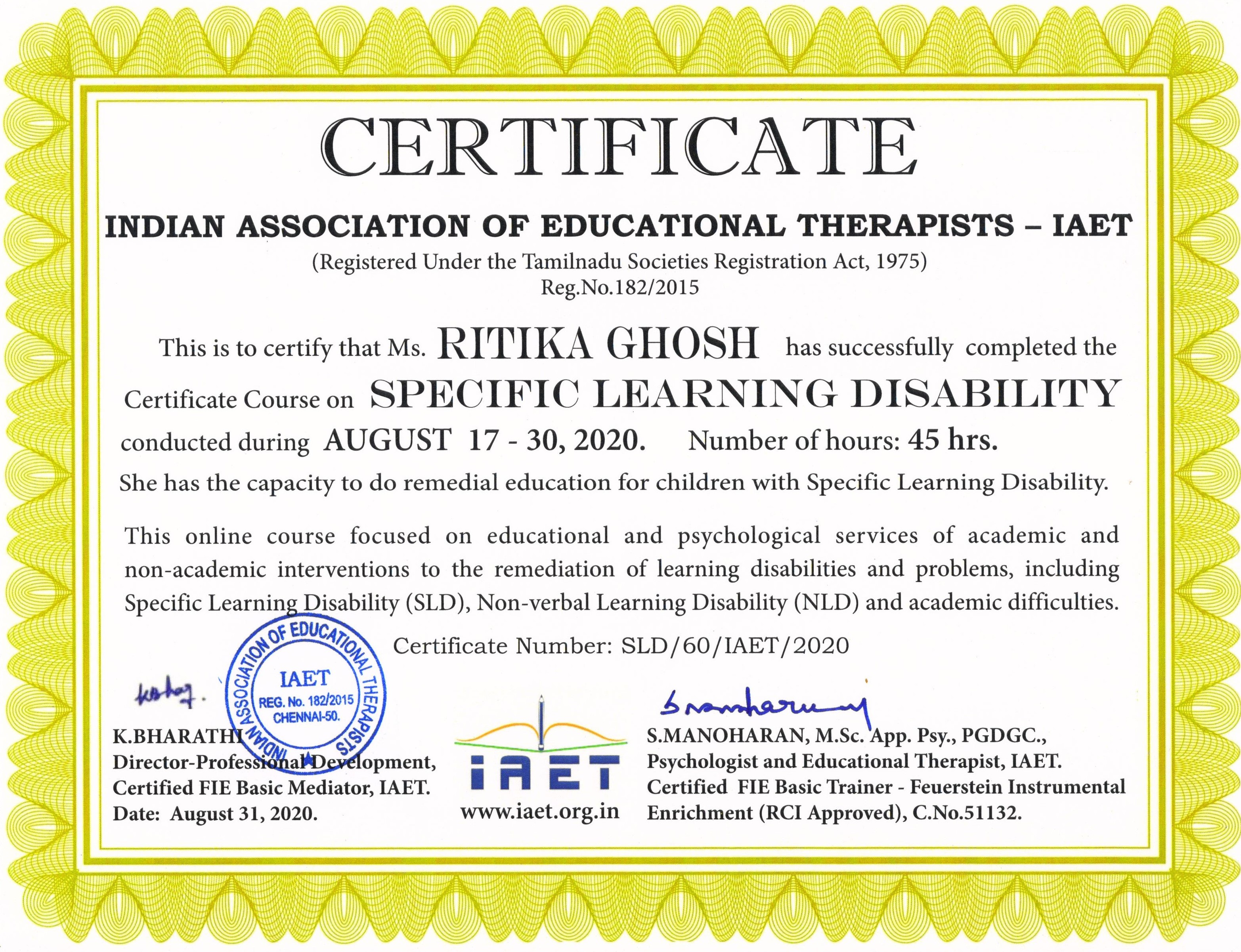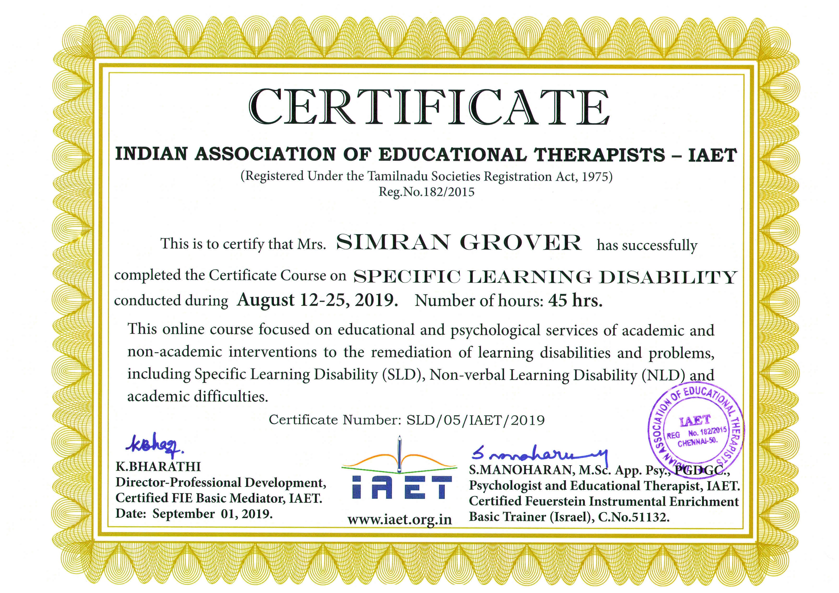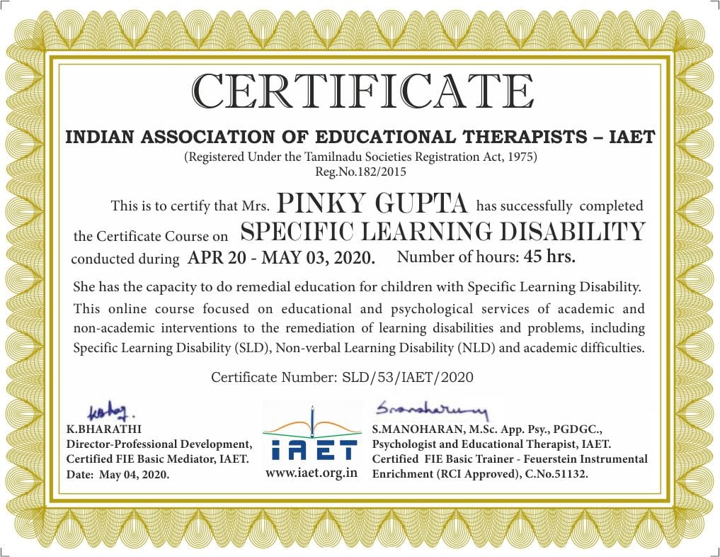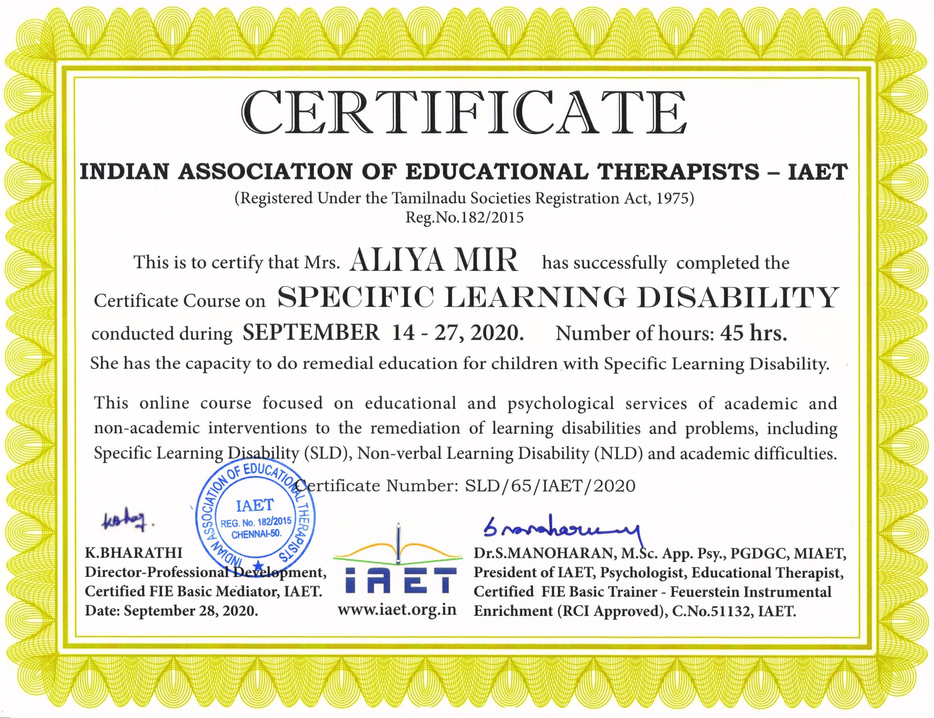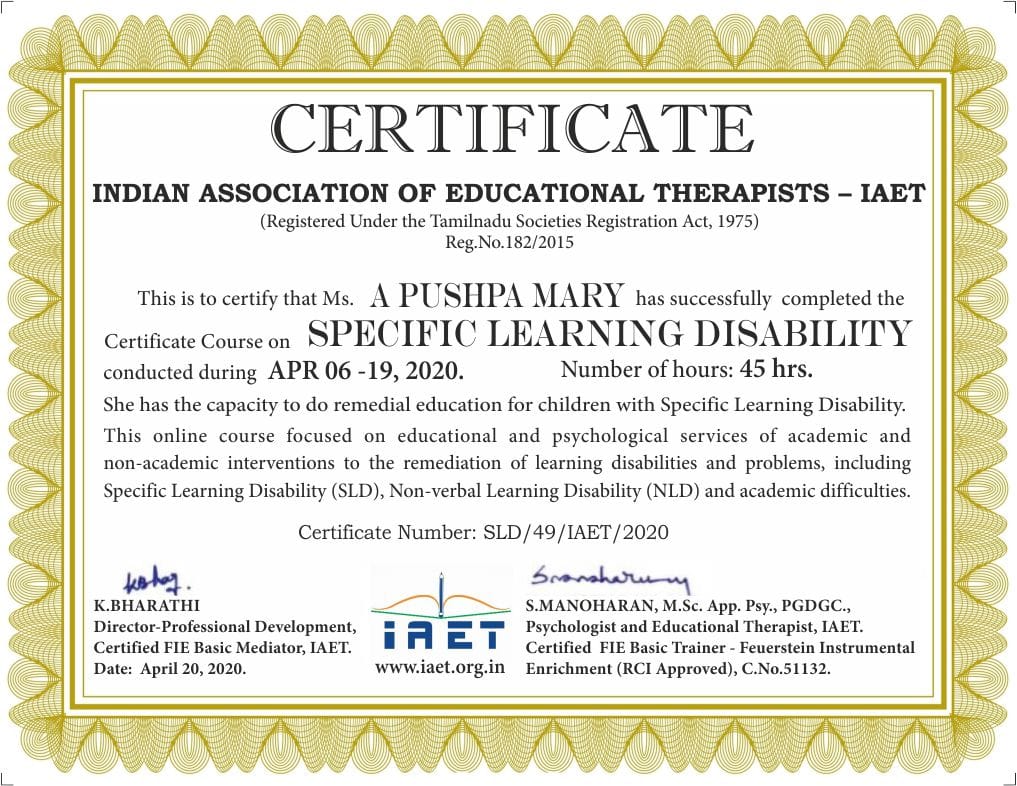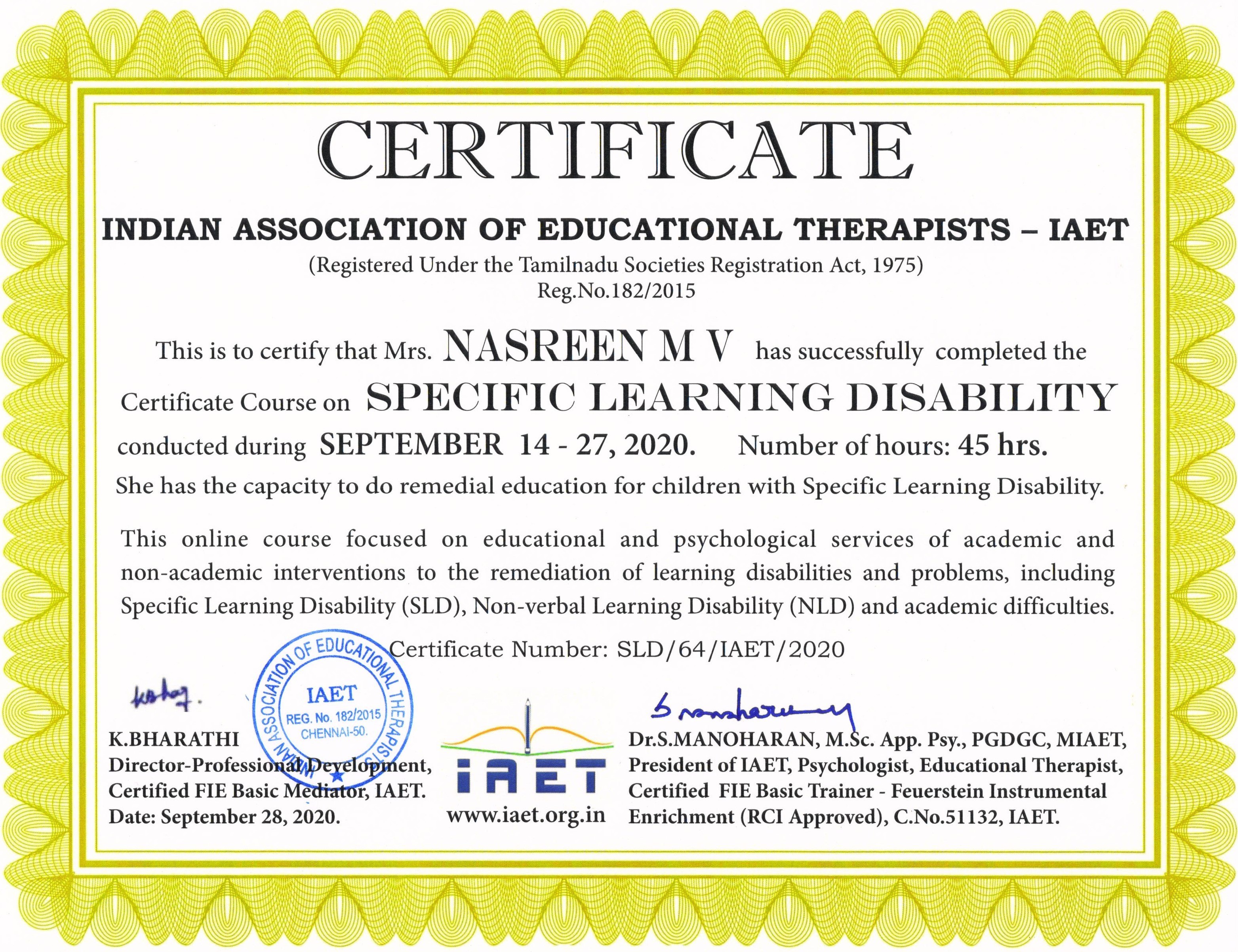 SPECIFIC LEARNING DISABILITY COURSE CERTIFICATES