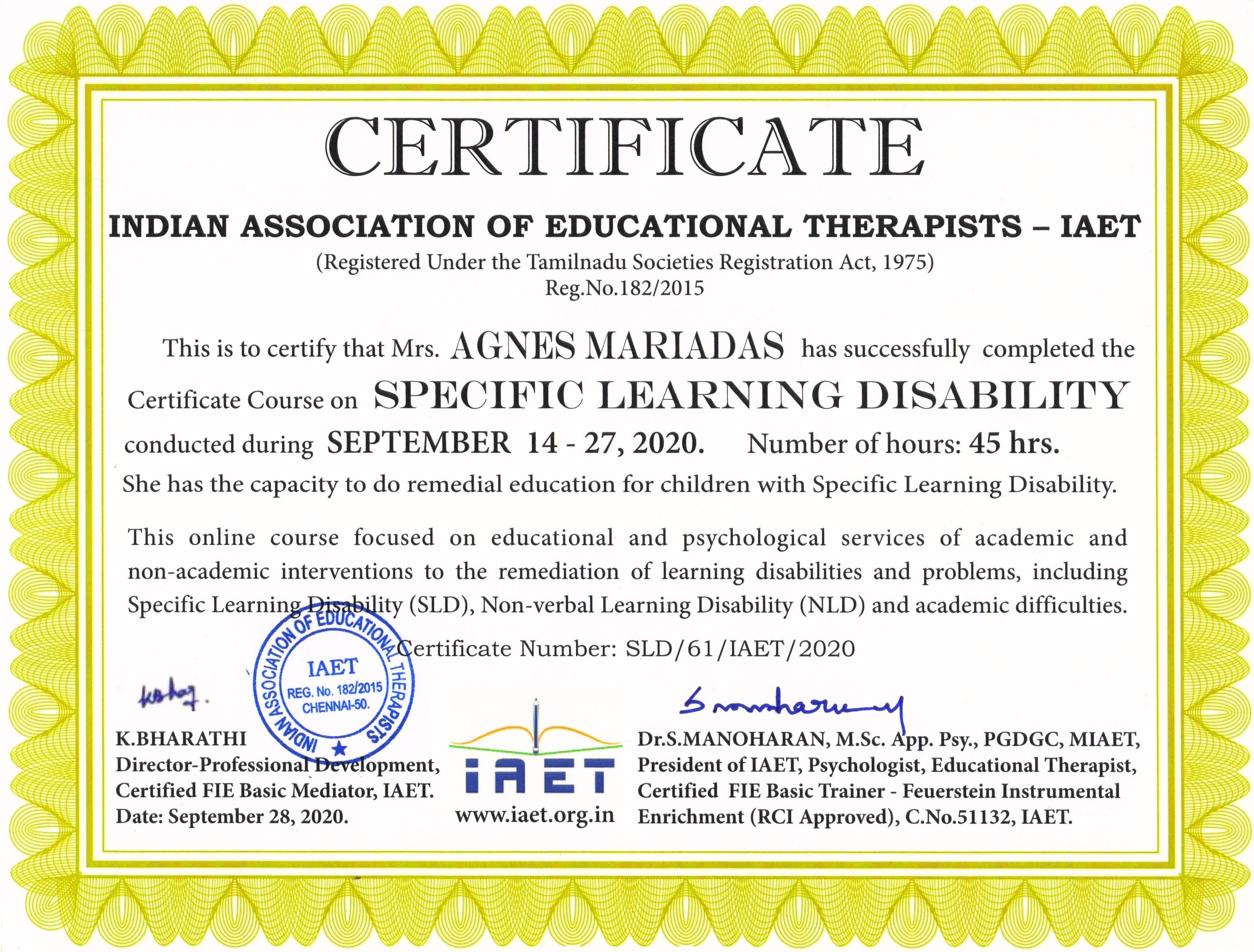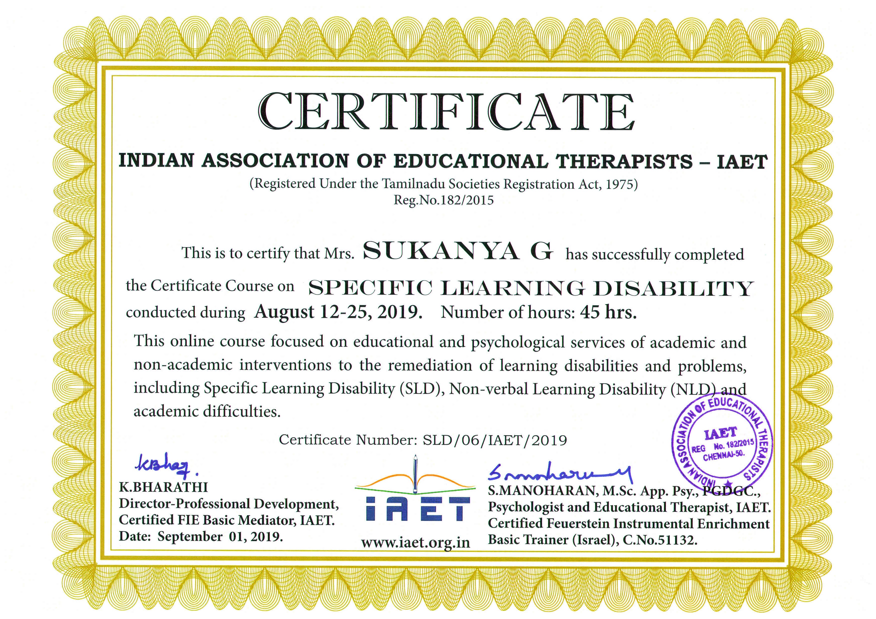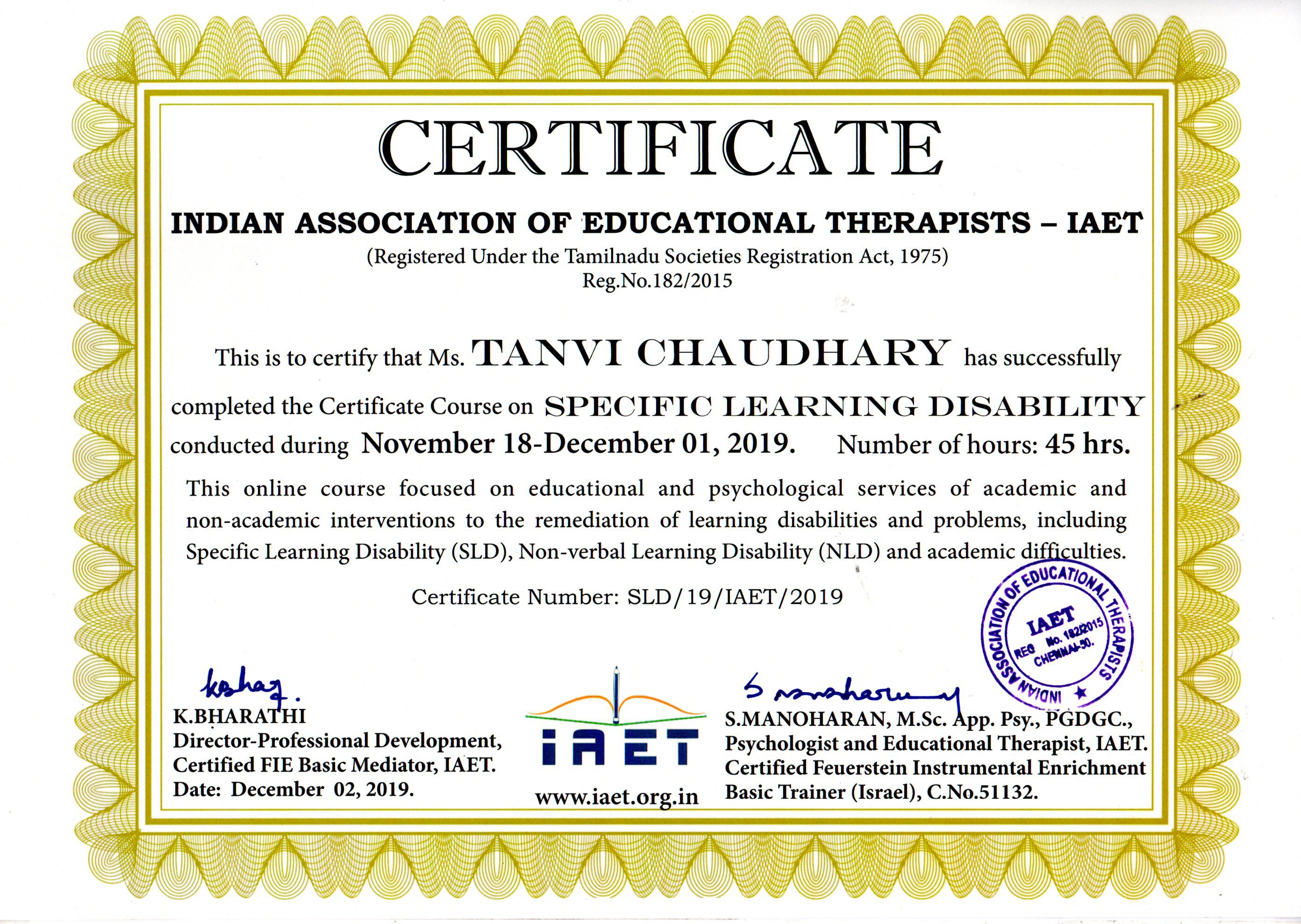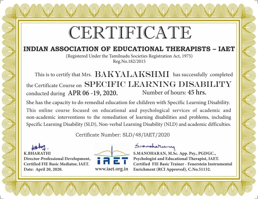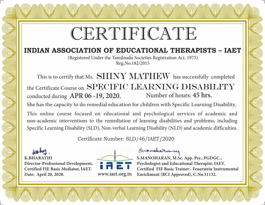 SPECIFIC LEARNING DISABILITY COURSE CERTIFICATES