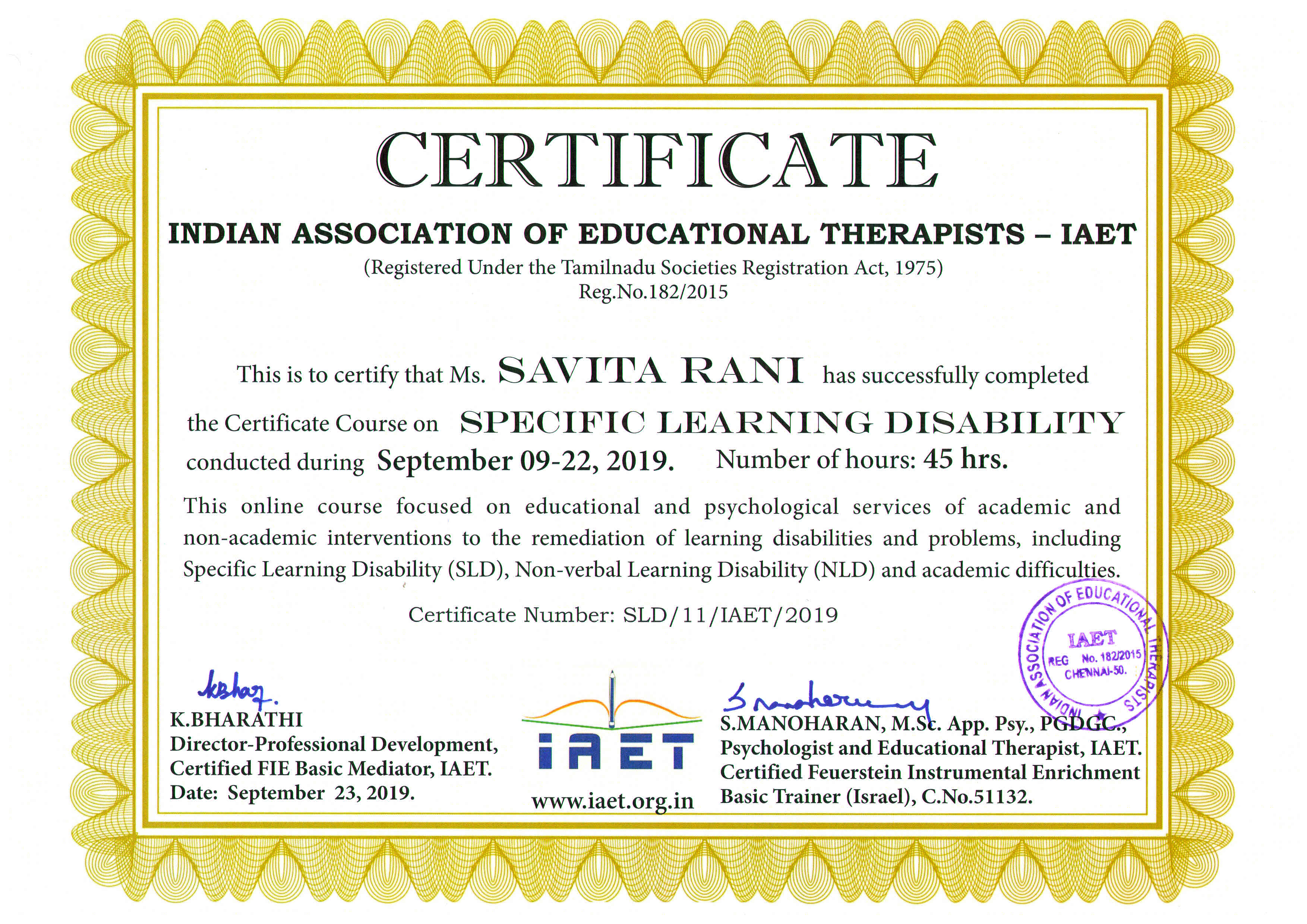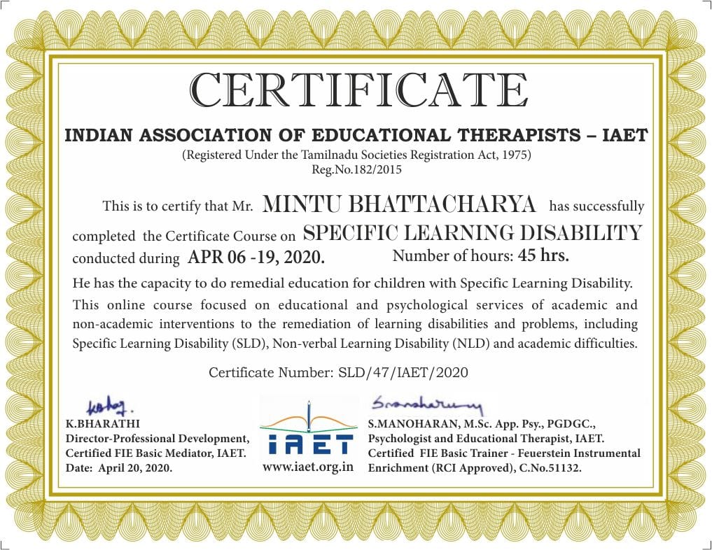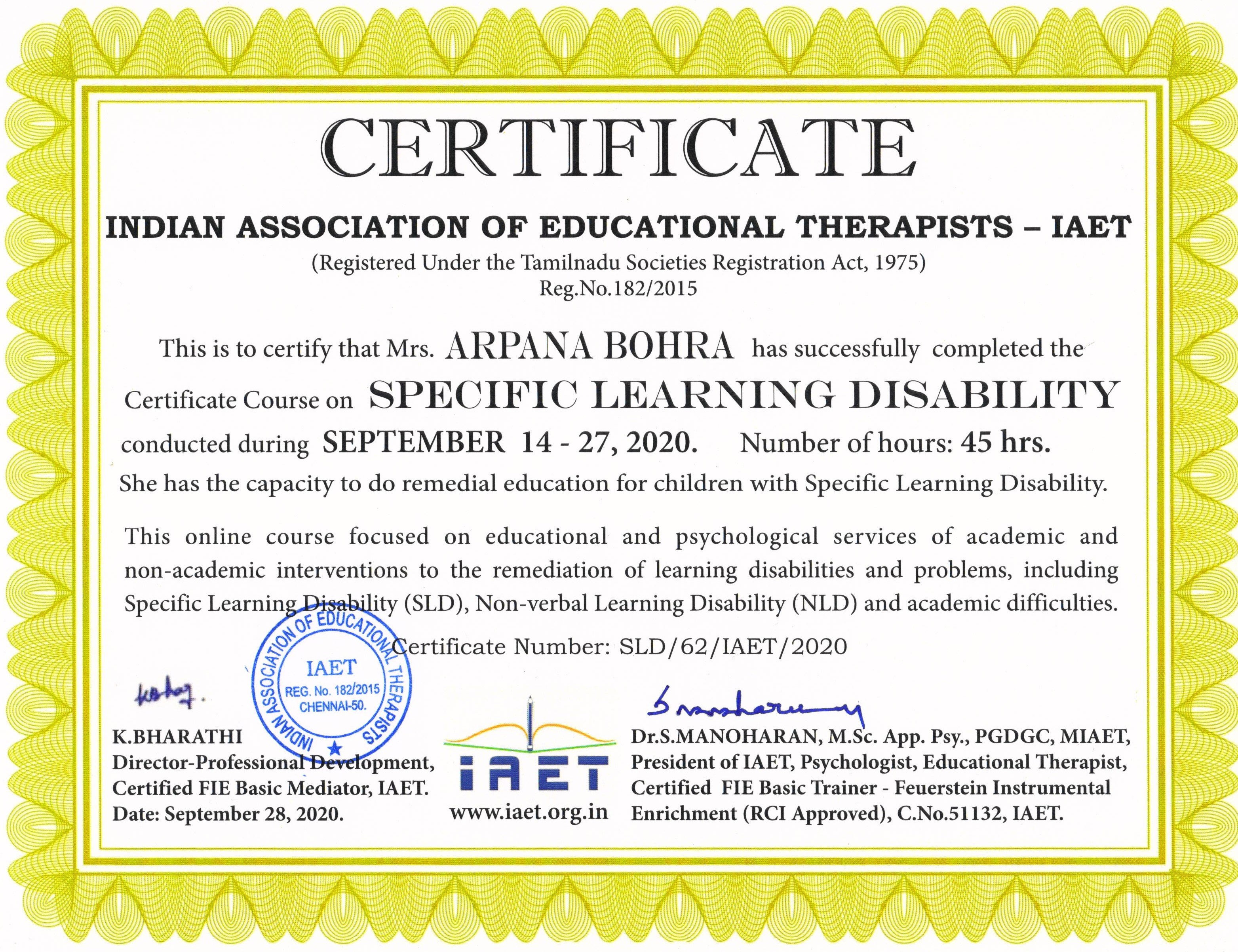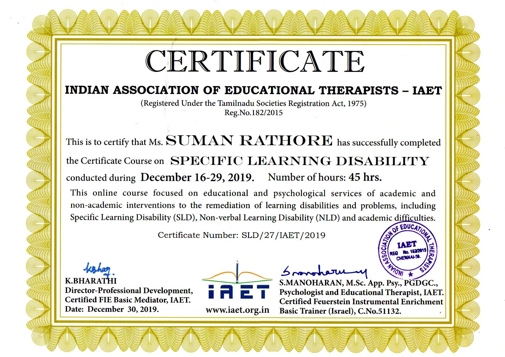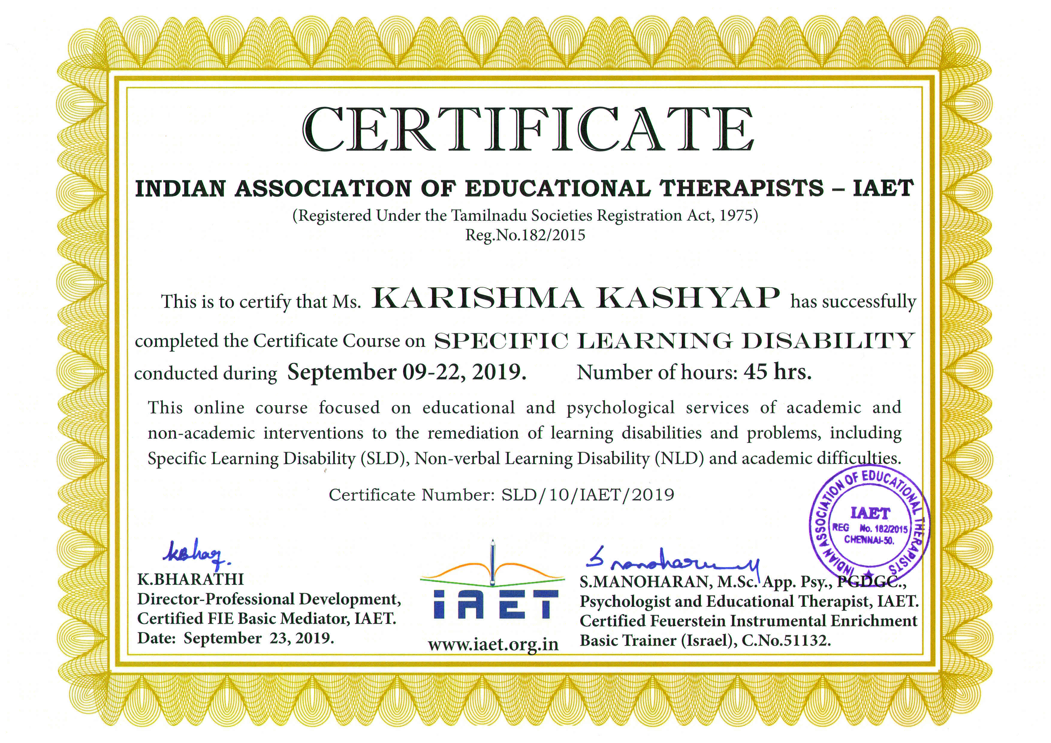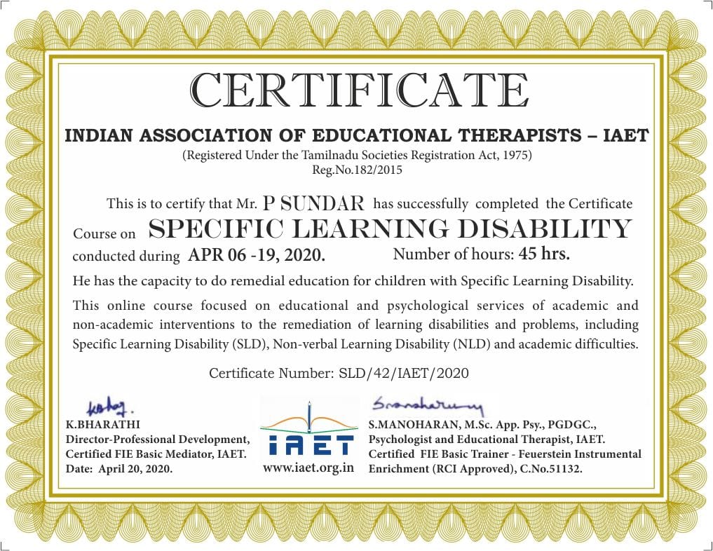 SPECIFIC LEARNING DISABILITY COURSE CERTIFICATES
