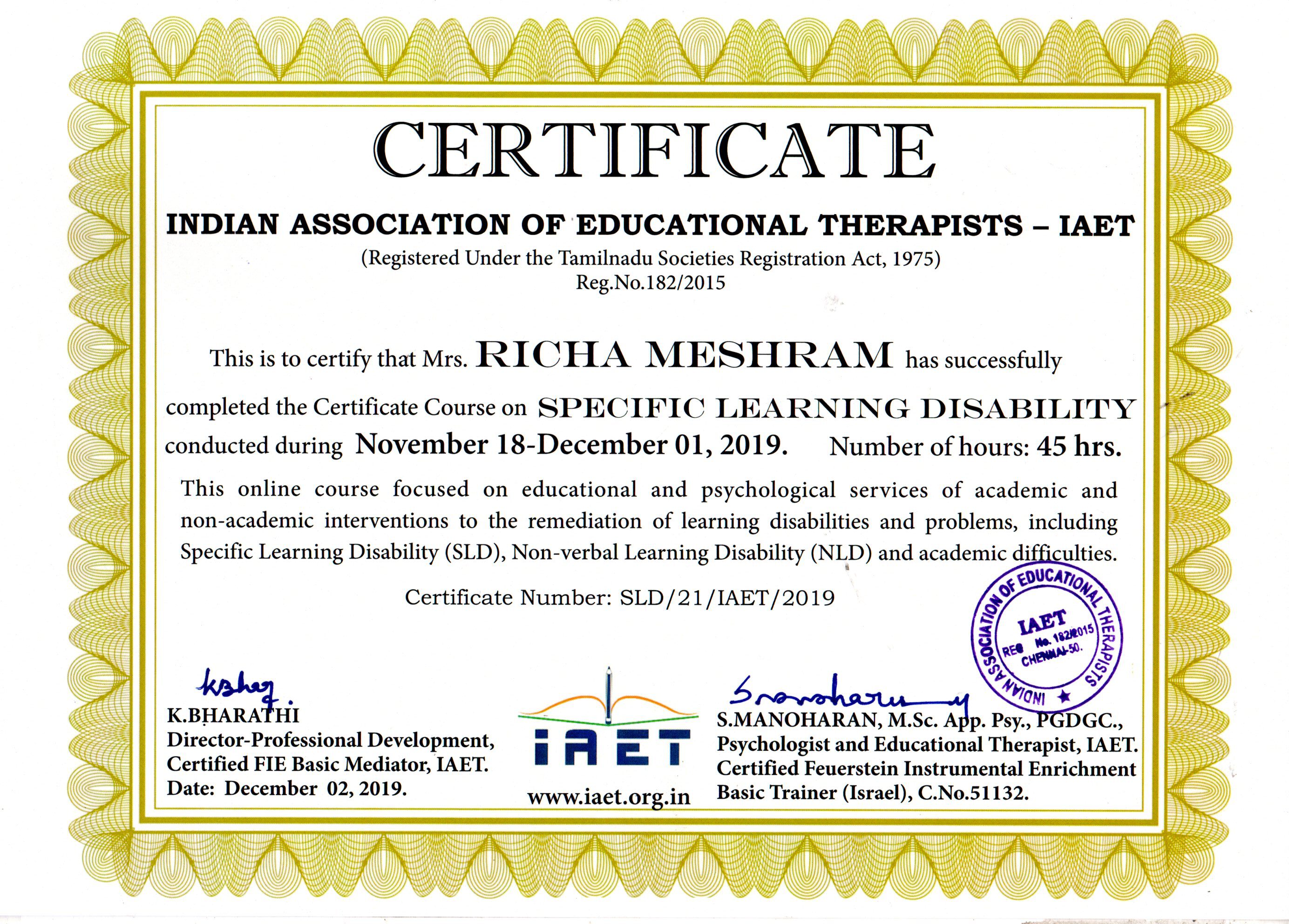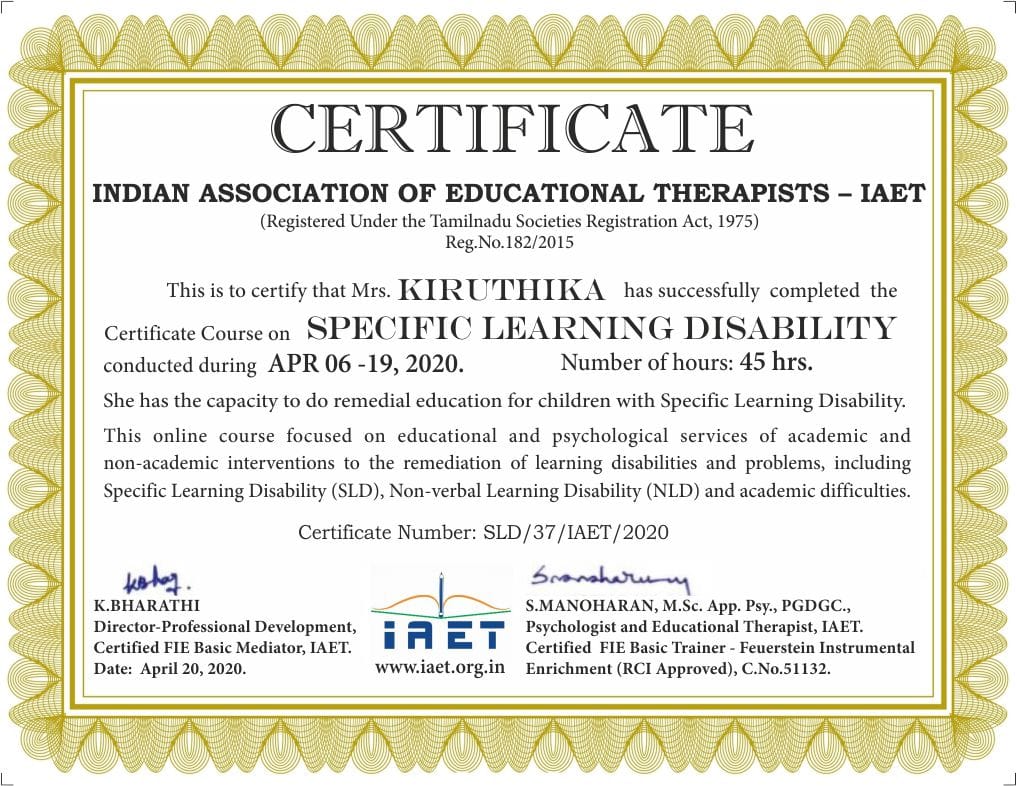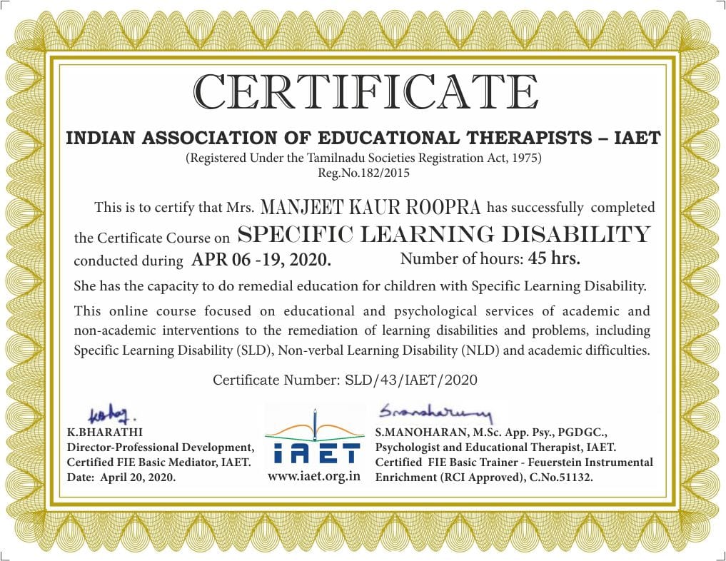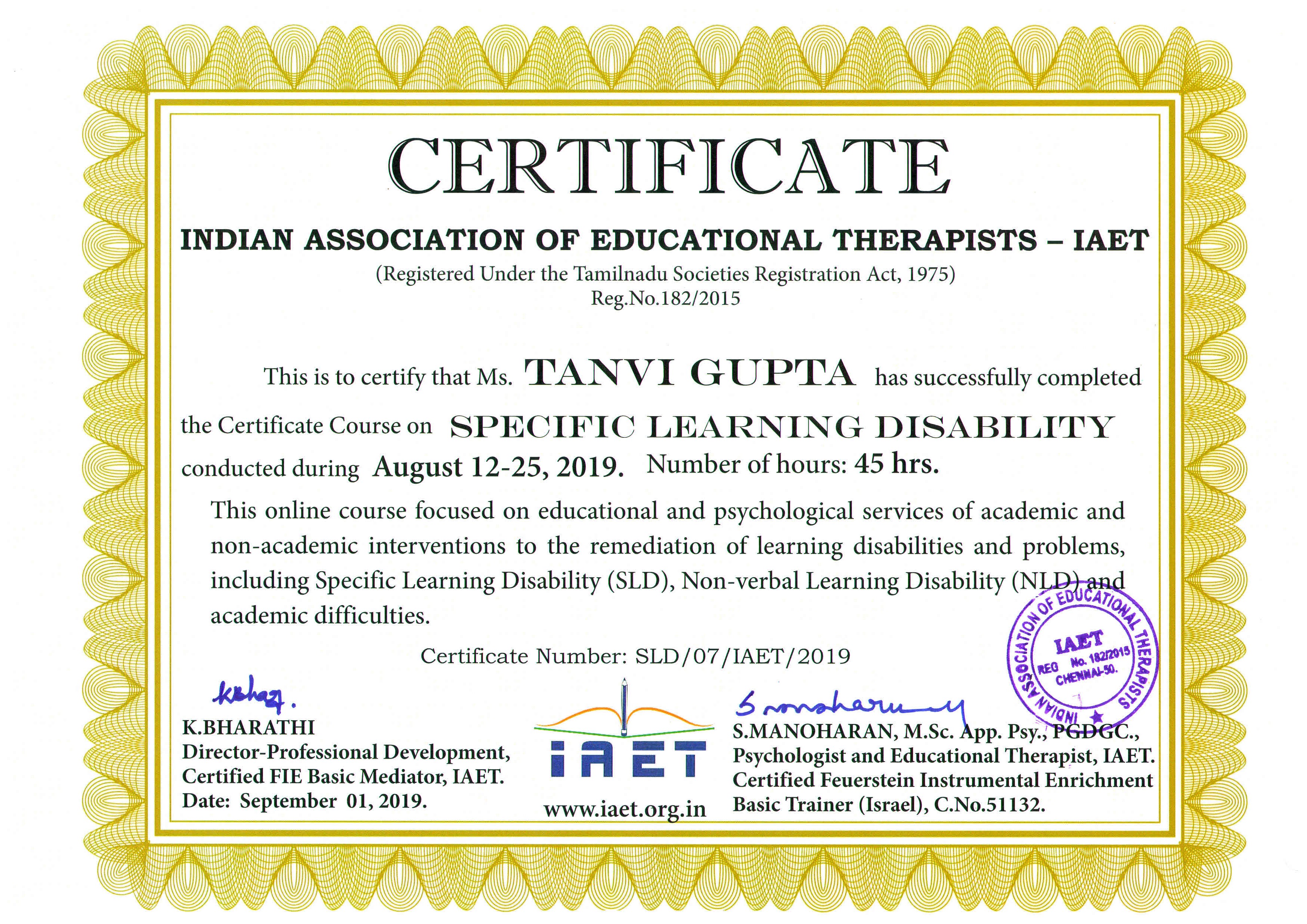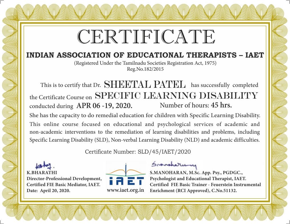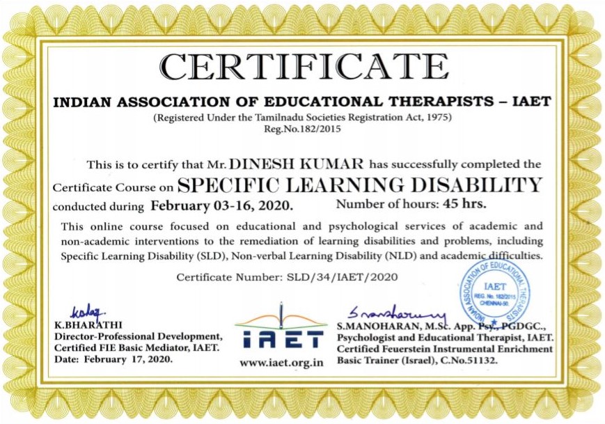 SPECIFIC LEARNING DISABILITY COURSE CERTIFICATES