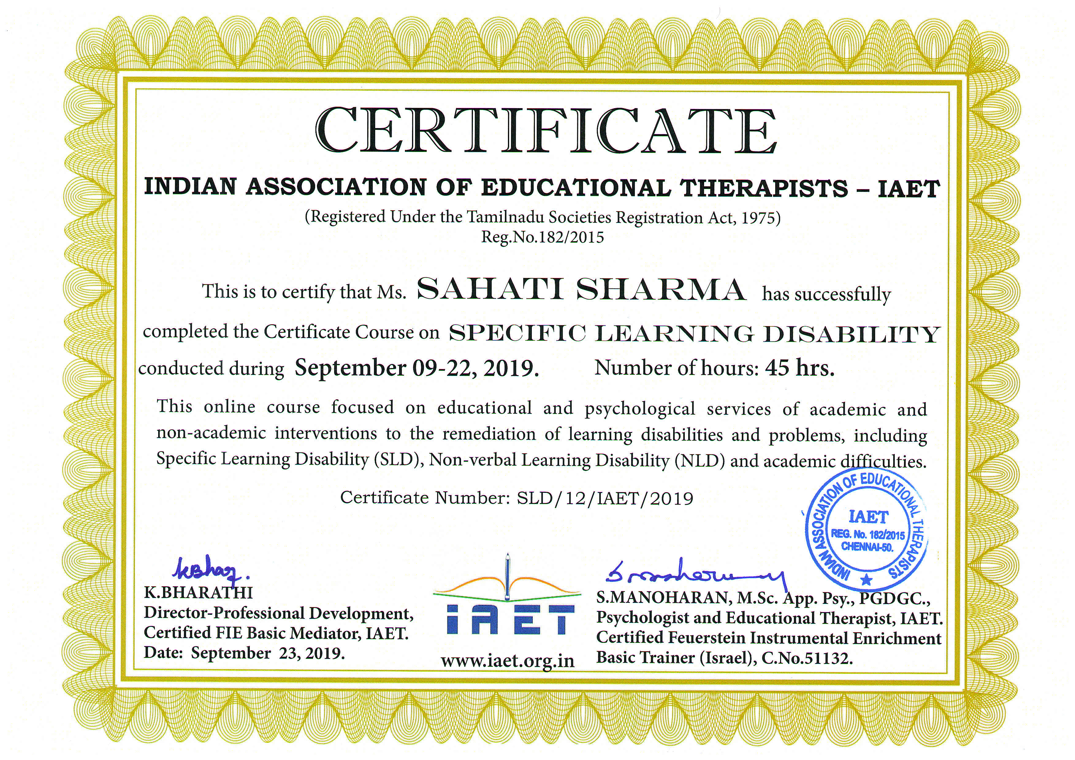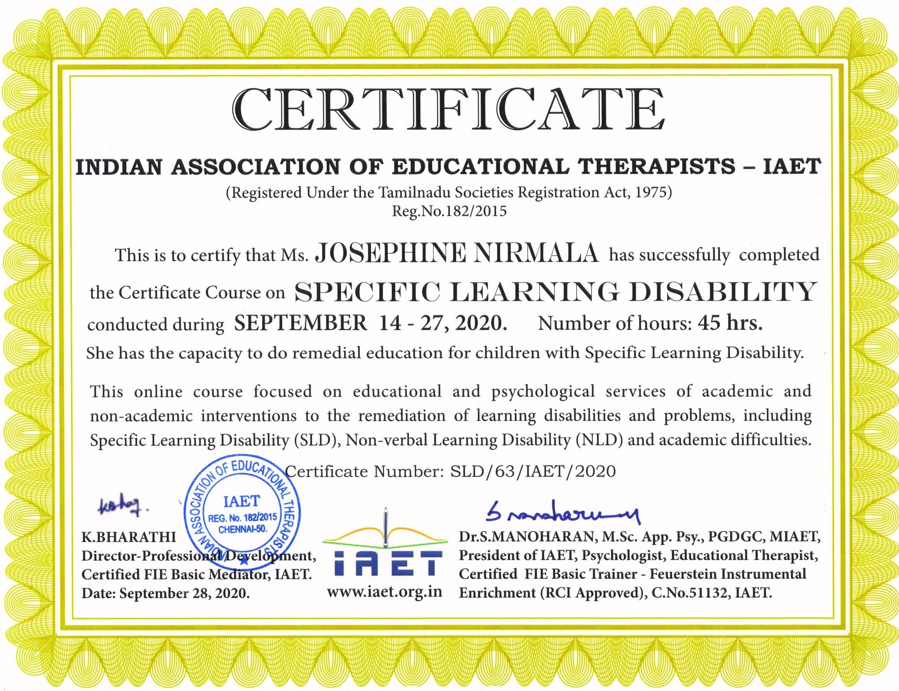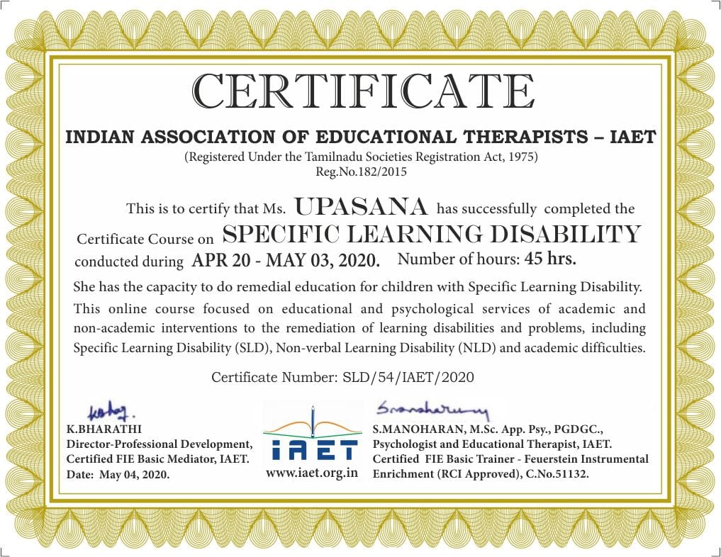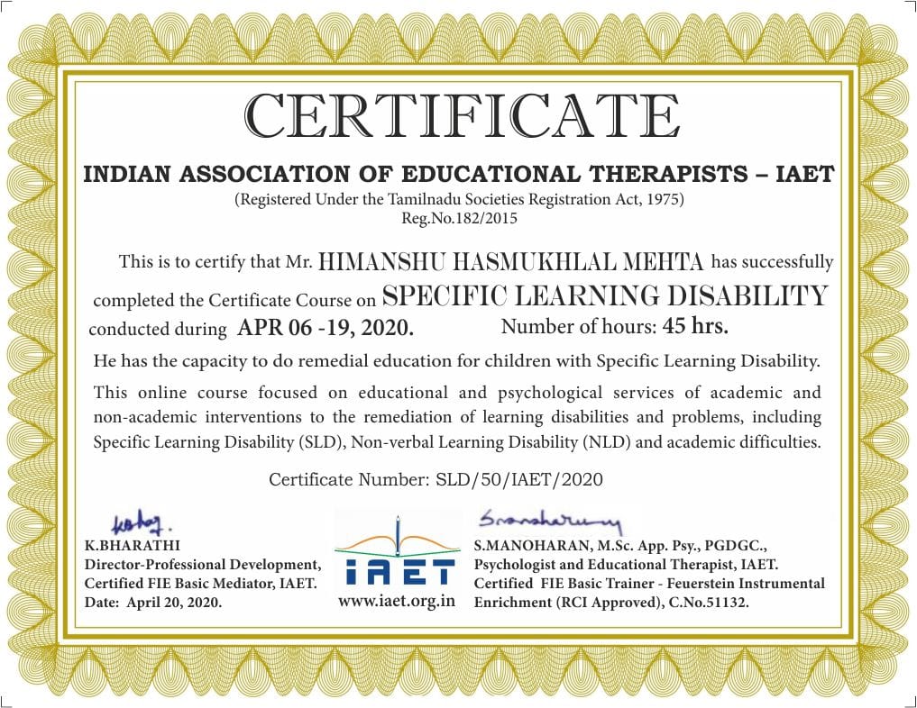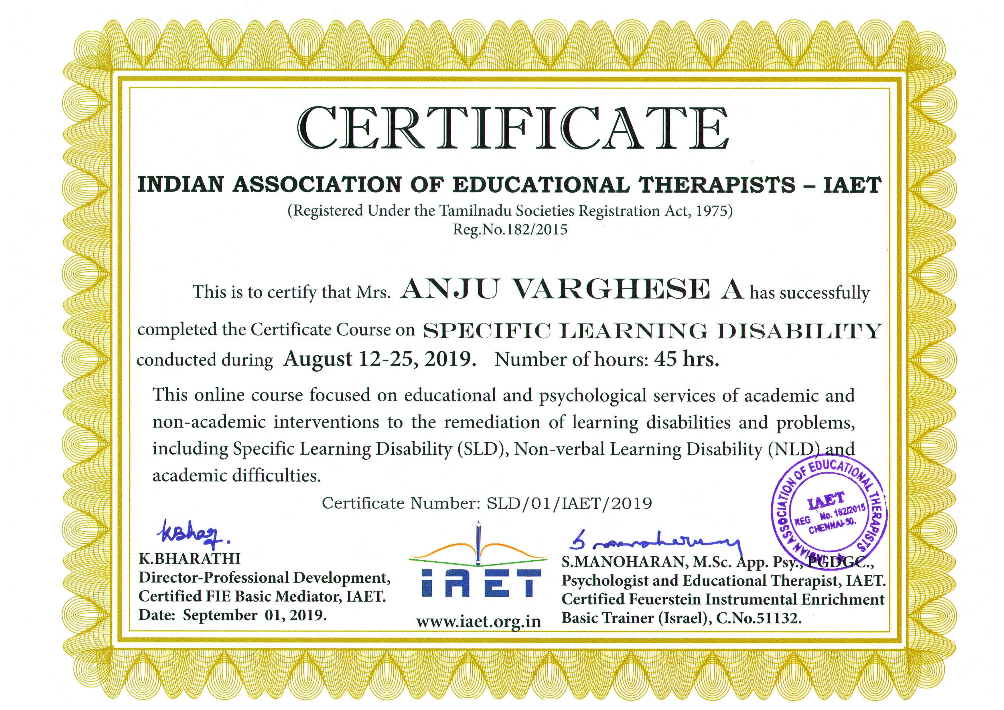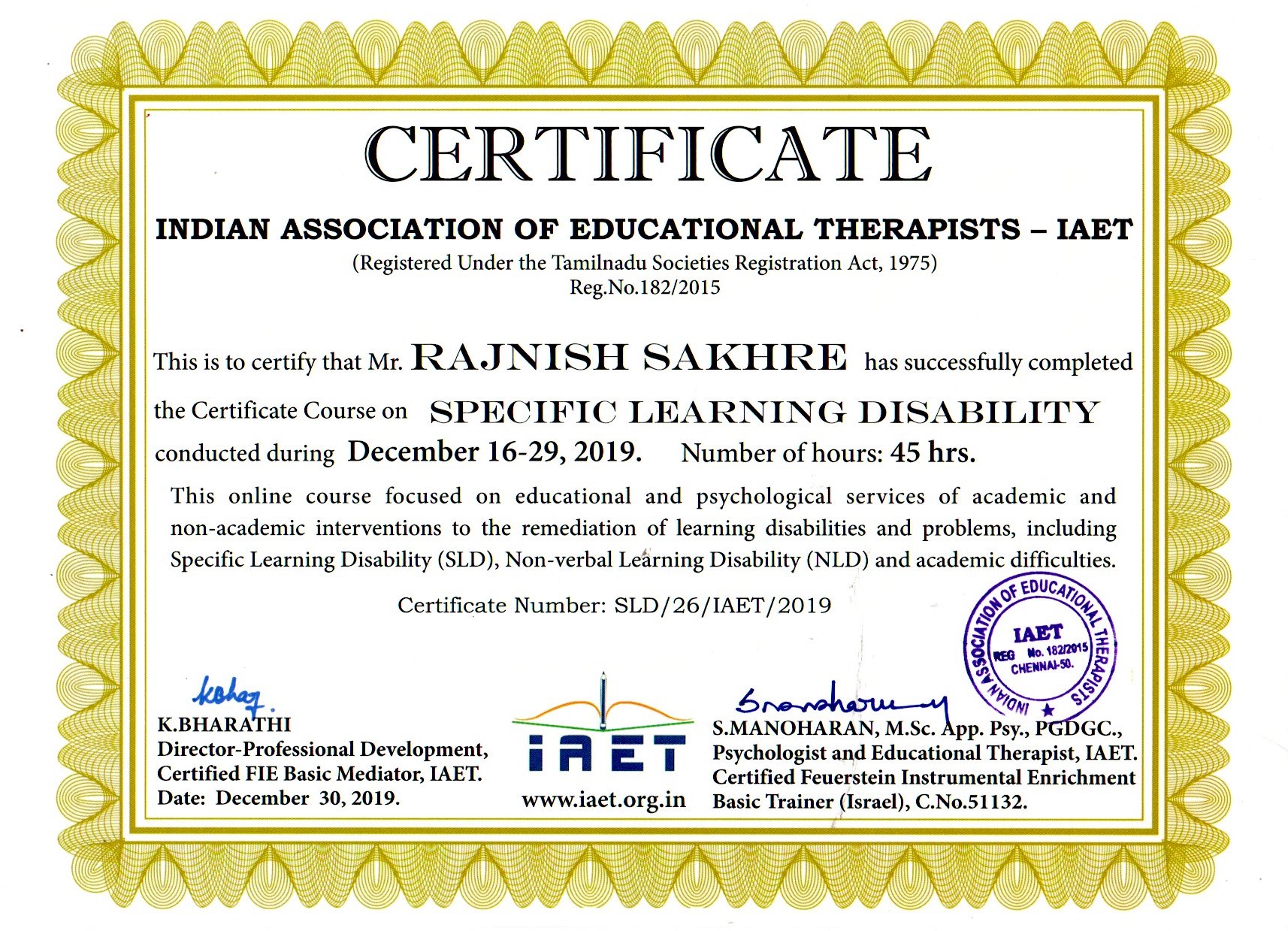 SPECIFIC LEARNING DISABILITY COURSE CERTIFICATES