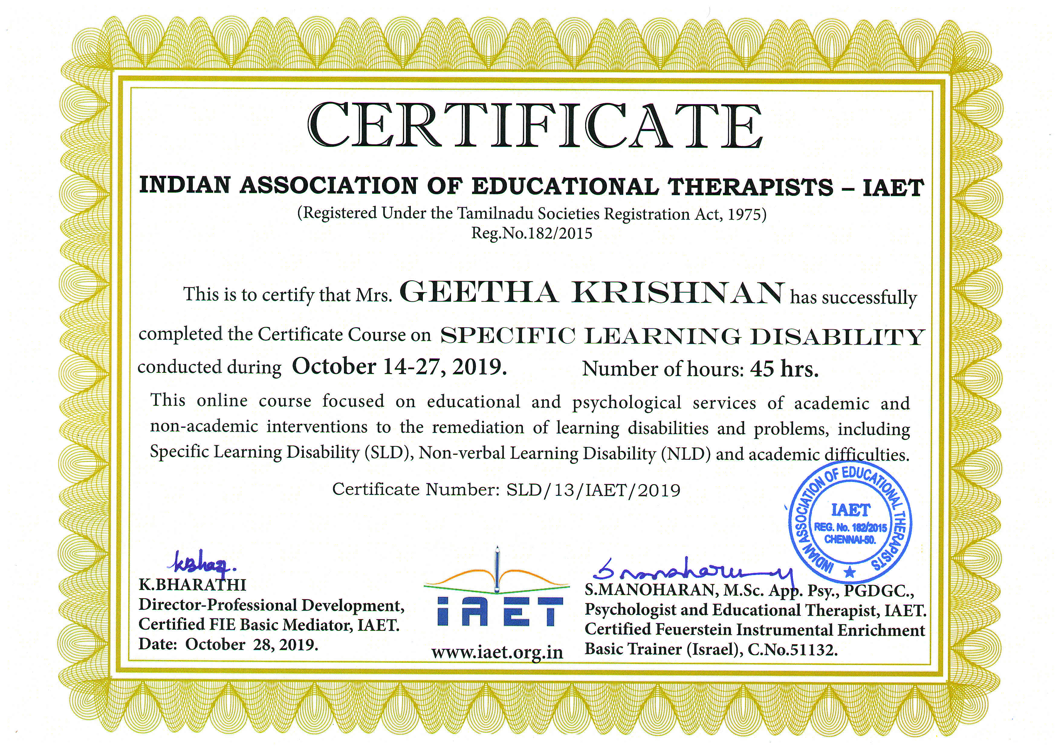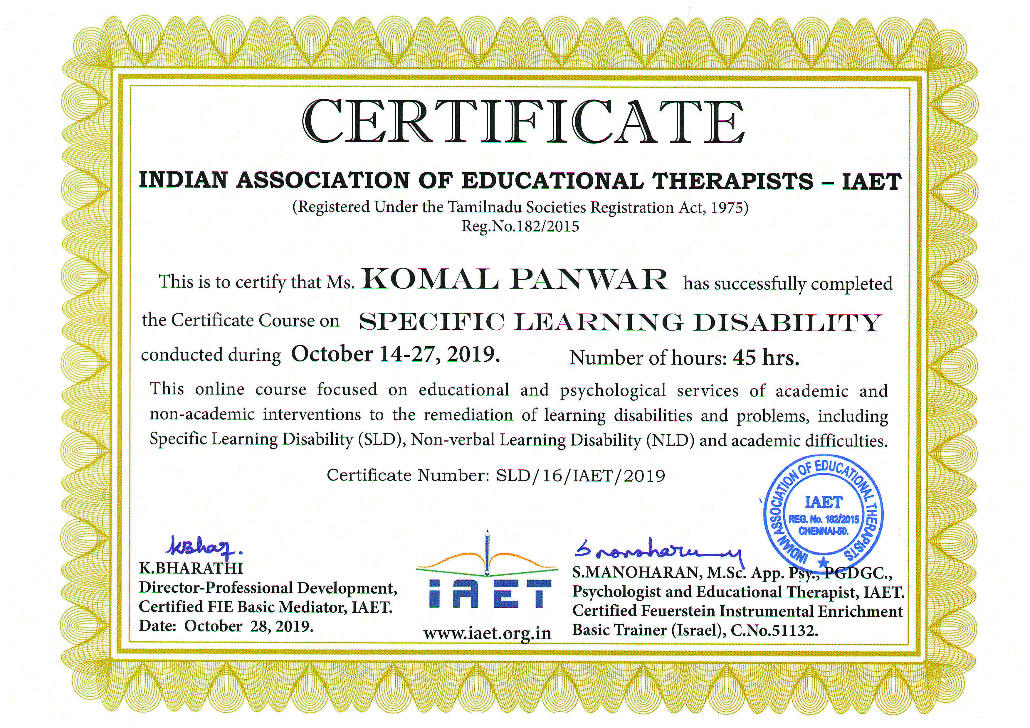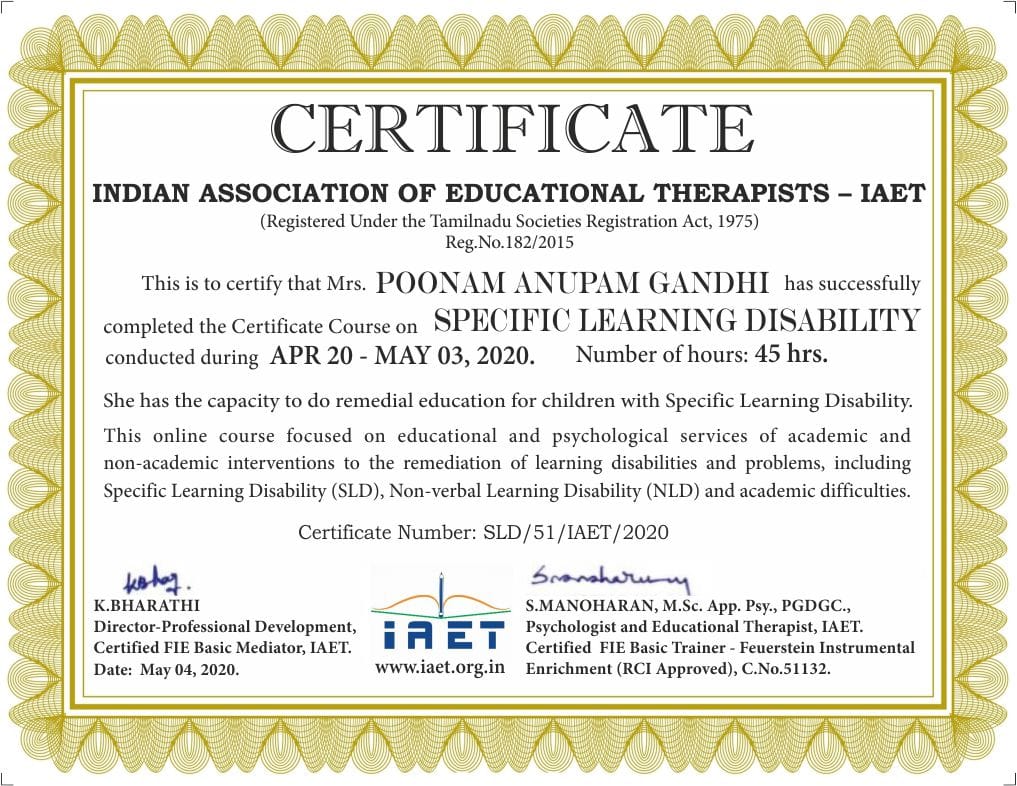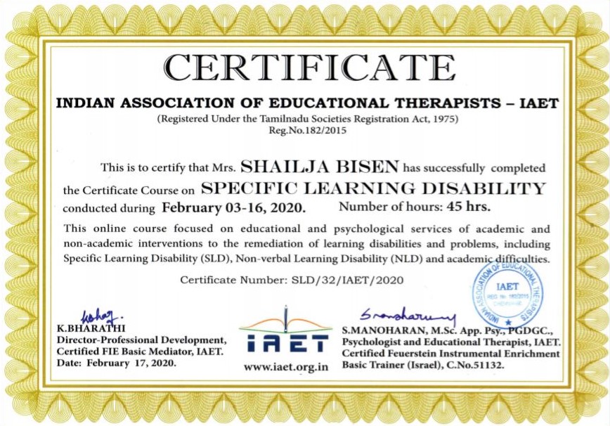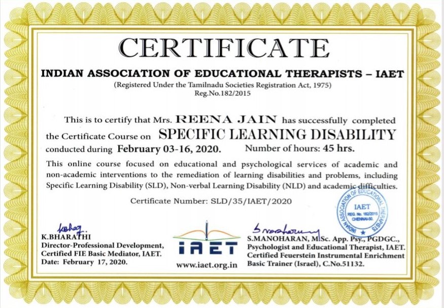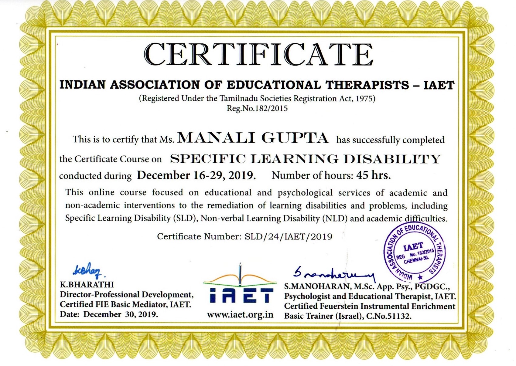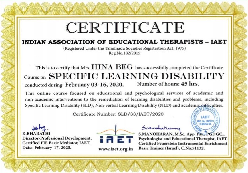 SPECIFIC LEARNING DISABILITY COURSE CERTIFICATES